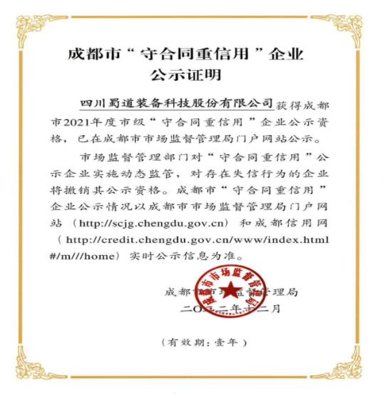 憑借長期積累沉淀的深厚實力和精細化的內控管理水平,蜀道裝備公司連續兩年通過成都市市場監督管理局評定,獲得市級“守合同重信用”企業稱號。