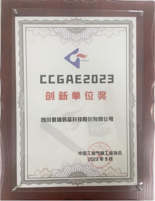 中國工業氣體協會還于9月14日同期舉辦了“CCGAE2023創新獎”頒獎典禮,蜀道裝備榮獲“創新單位獎”與“創新產品獎”兩項榮譽,充分體現了協會對蜀道裝備“質量信譽求生存、技術開發求發展”企業方針的高度認可。展會期間,中國氣體協會常務副理事長洑春干先生等協會領導蒞臨蜀道裝備展位參觀指導,充分了解公司近年來的經營定位和技術發展,對會員單位在行業的突出貢獻予以了高度肯定。