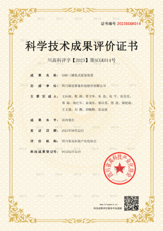 日前,由四川蜀道裝備科技股份有限公司自主研發的SDHE-I撬裝式提氦裝置成功通過科學技術成果鑒定。鑒定評價為該成果技術成熟,社會效益和經濟效益前景良好,總體技術水平達到國內領先,裝置單位能耗、液氮消耗等指標達到了國際先進水平。