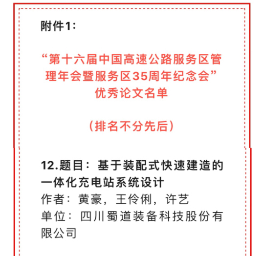 10月9日,中國公路學會發布“第十六屆中國高速公路服務區管理年會暨服務區35周年紀念會”論文評審結果,四川蜀道裝備科技股份有限公司黃豪王伶俐論文作品《基于裝配式快速建造的一體化充電站系統設計》成功獲評全國20篇“優秀論文”之一,為我省兩篇獲選優秀論文作品之一。