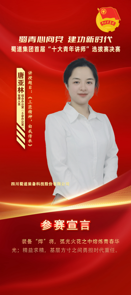 4月26日,“蜀青心向黨 建功新時代”蜀道集團首屆十大青年講師選拔賽決賽暨2024年五四主題團日活動圓滿結束,我公司員工唐亞林以總分排名第二的成績,榮獲蜀道集團“十大青年講師”稱號!