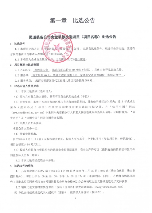 四川蜀道裝備科技股份有限公司食堂裝修改造項目比選公告